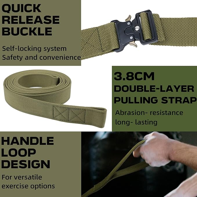 - DURABLE SLED PULLING STRAP: The sled pulling rope is 118'' long, sufficient for pulling heavy loads. It features a 3.8 cm wide double-layered nylon strap, sewn with reinforced stitching to prevent wear and breakage during prolonged use. At the other end of the sled pulling rope, we have included a handle loop, allowing for various exercise methods to be employed.