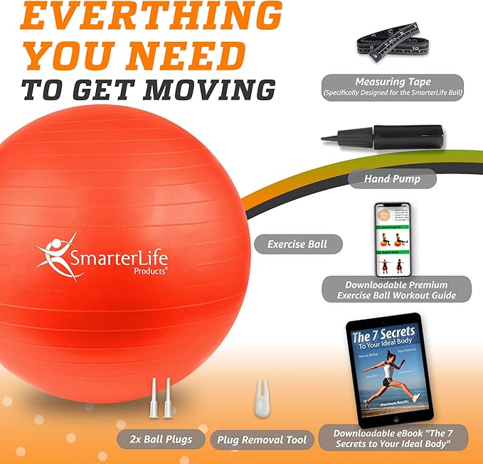 - WHAT'S INCLUDED: We include the exercise sitting ball, an exercise ball pump, inflation measuring tape, two (2) ball plugs with a removal tool, an exclusive downloadable complete body workout guide, and a downloadable eBook called "The 7 Secrets to Your Ideal Body." Also downloadable is our “Premium Exercise Ball Workout Guide” which picks up where the included-in-the-box “QuickStart Exercise Guide” leaves off. The download instructions are included in a sheet in the box.
