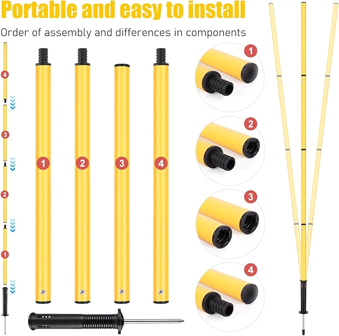 - Portable and Easy to Install : This agility poles is lightweight and easy to store. You can easily put the soccer agility poles into your carry bag and train anytime and anywhere. Multi-section assembly design allows four different height settings: 62 inches, 47 inches, 32 inches, 17 inches. Different heights adapt to the training of athletes of different ages.