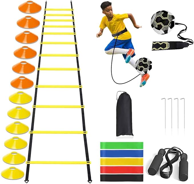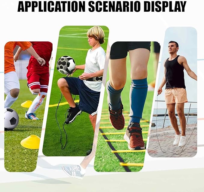 • 【Complete Sports Training Set】This is a comprehensive soccer training equipment. Each kit includes a 20ft 12 Rungs agility ladder, 12 soccer cones, 1x solo soccer/volleyball trainer, 4 steel stakes for added stability, 1 x jump rope, 5 loop resistance bandsand a carrying bag.