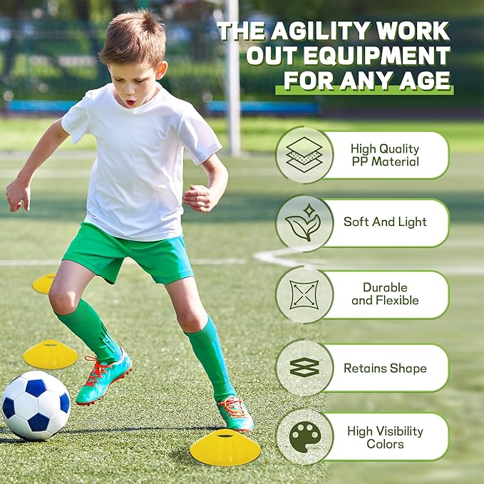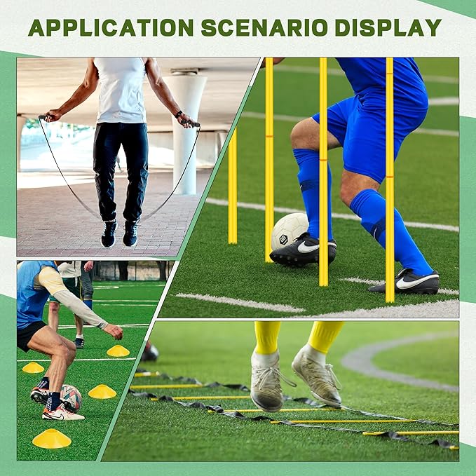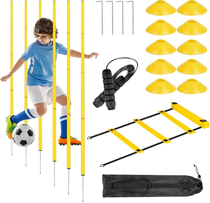 • Comprehensive Agility Training Kit: This soccer training equipment set includes 6 adjustable agility poles, a 19.6 ft speed agility ladder, 10 soccer cones, a jump rope, 4 ground stakes, and a carry bag. Perfect for a complete speed and agility training routine.
