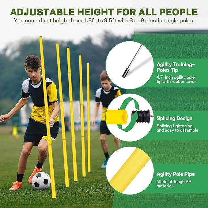 • Adjustable & Durable Agility Poles: The 6 detachable soccer agility poles can be customized to a height of 70.8 inches/1.8 meters. Each pole consists of 4 sections, providing flexibility for all levels of soccer and football training.
