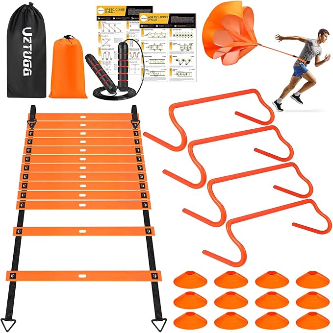 - 【Complete Training Equipment】Our complete speed and agility training equipment bundle is expertly crafted to help you unleash your full athletic potential. With top-of-the-line equipment like the 20-foot advanced agility ladder, hurdles, cones, jump rope and a running parachute, you'll be set for a comprehensive fitness workout that caters to trainers and individuals seeking variety in their routines.