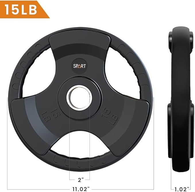 - 💪FEATURE: SPART weight plates have a solid iron core and slide rubber surface. This design can protect the floor from damage and ensure enough weight when you do exercise. The strong steel ring insert can help you assembly the barbell easily. The three holes are designed for grip according to your hands and you can do weightlifting exercise with single plate as well.
