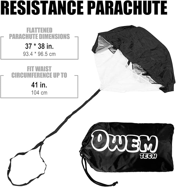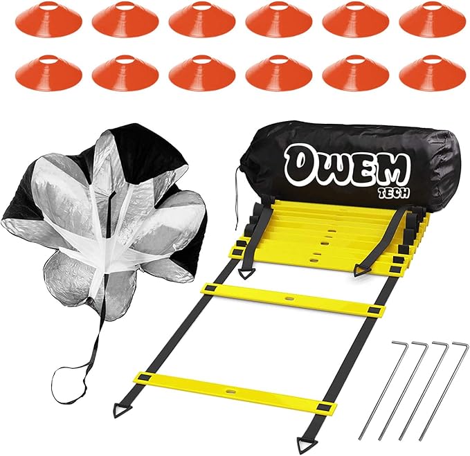 - Training Set Includes: speed & agility training set includes 20 ft long agility ladder, a high resistance parachute,12 disc cones, 4 steel stakess and 2 storage bag.