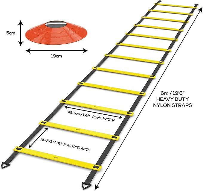 - Training Set Includes: speed & agility training set includes 20 ft long agility ladder, a high resistance parachute,12 disc cones, 4 steel stakess and 2 storage bag.