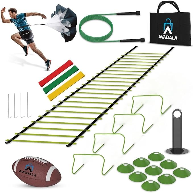 - COMPLETE TRAINING KIT - Maximize your athletic potential with our all-in-one speed and agility training equipment set. This comprehensive kit includes adjustable hurdles, disc cones, a jump rope, a parachute, a ladder, a football, and bands—perfectly designed to enhance your performance and help you master any sport.