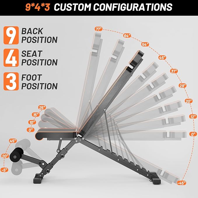 - [Fast angles adjustment for different positions]- The exercise benches feature a secure serrated cushion adjustment design on the backrest, allowing for 9 angles of adjustment to target your abs, arms, chest, and more effectively. These various angles offer optimal support and protection for your entire spine, especially your neck, ensuring a safe and injury-free workout experience. This workout bench for home gym will be a great helper for your health exercising