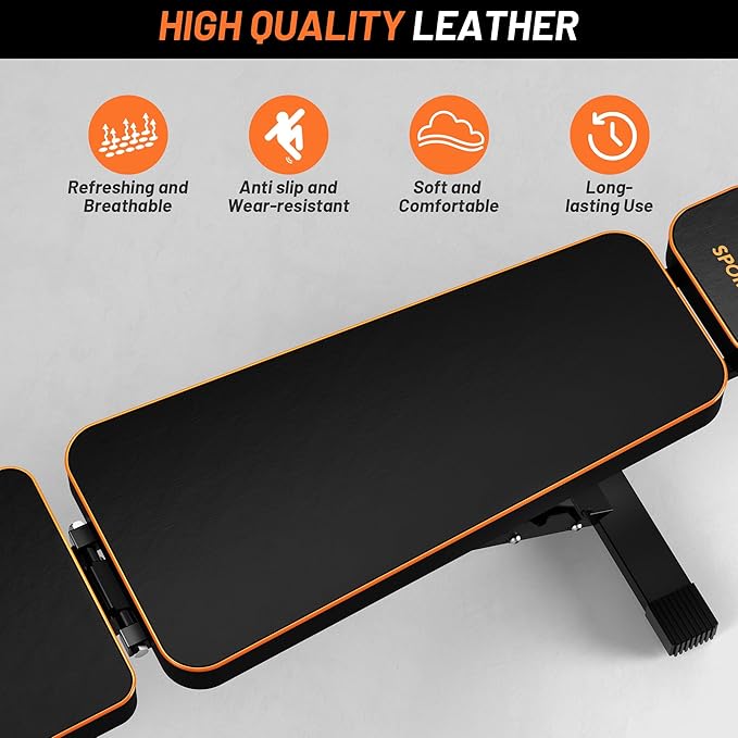 - [Heavy duty weight bench] -This is an affordable, stable and effective weight bench for home gym. Constructed from heavy duty steel with a unique triangular structure, this workout bench features a sturdy support for the toughest workouts. Made from high-density foam, the back pad and seat pad are extra thick with breathable PU leather cover. All of these features for this workout bench press enhance comfort and safety during your workout