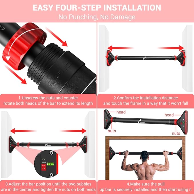 - Easy-peasy Installation: The installation is quite easy. Guided by detailed instructions and video, plus 5 arrow directions on the surface and spirit levels on both ends to make your installation smooth. All you have to do is extend it to the comfortable length and height and you are good to go! Please make sure your doorway or wall is strong enough for installation. Ceramic tiles, glass, or non-solid structures are not ideal surfaces to install the fitness bar.
