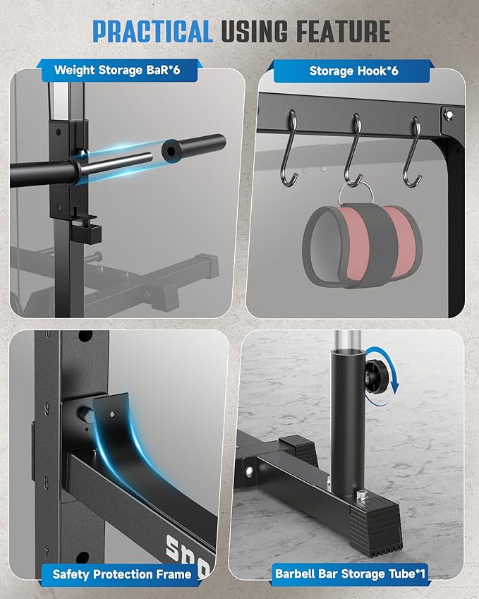 - 【Practical Using Feature】Say goodbye to a cluttered floor. Sportsroyals power rack for home gym is built with 1 barbell bar storage holder, 6 weight storage racks, and 6 handle storage hooks, it can perfectly organize all your gym accessories and weight plates. In addition, the rubber pads on the safety frame and safety rod can provide good cushioning, and ensure the safety of workouts.
