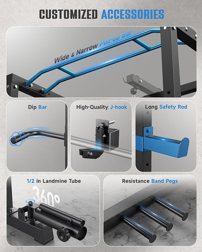 - 【Fully Equipped & Versatile】- No need to buy the extra fitness accessories. All come with Sportsroyals home gym power cage. It included: lat pull-down bar*1, cable bar*1, cable handle*2, J-Hook*2, safety frame*2, safety rod*2, wide&narrow pull-up frame, dip bar*2, 360° landmine*1, foot board*1, band peg*6, 1"&2" barbell clamps*6, In addition, the weight plate storage bracket fits the 2" Olympic or 1" standard weight plates.
