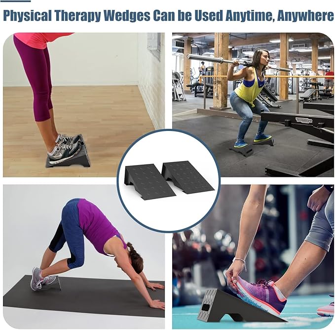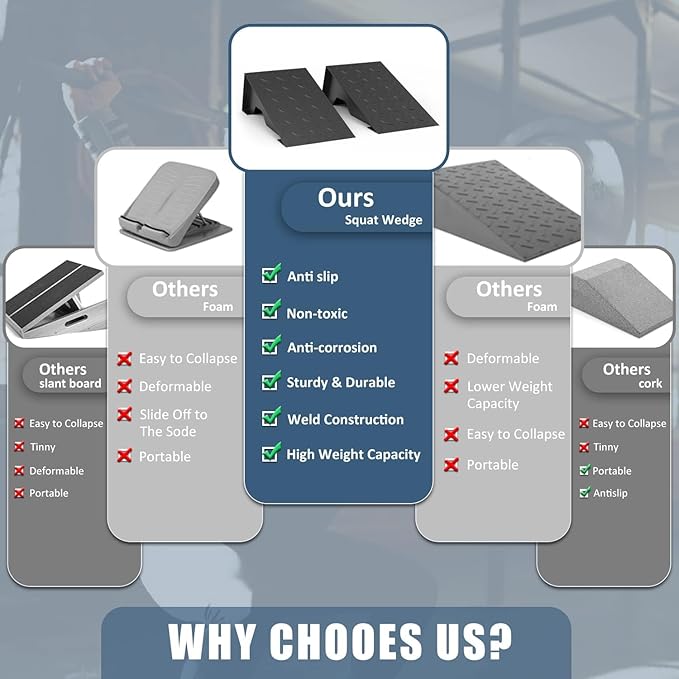 - 🏋🏻♀【YOU NEED SQUAT WEDGE BLOCK】This squat wedge can keep you in a right posture and helps improve squats and poor mobility by providing good support for your ankles, knees, and hips. Long-term use will make your muscles more responsive and stronger, reducing the risk of injury and improving exercise efficiency.