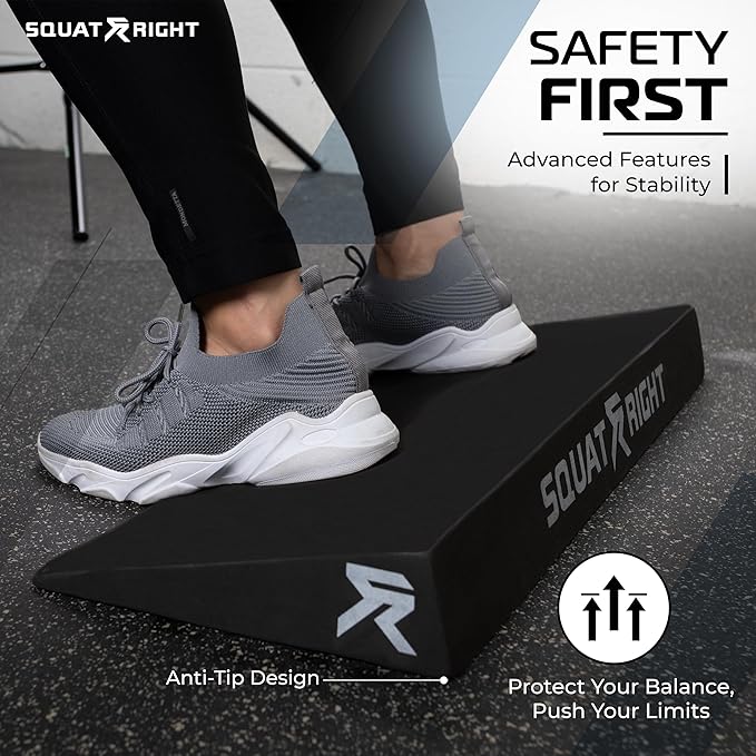 - SAFETY ANGLE ➔ Squat Right heel wedge for squats boasts an improved anti-tip angle for added security during specific exercises. Stay balanced and confident throughout your training, knowing that your safety is our top priority.