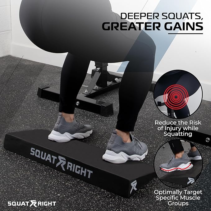 - TAKE YOUR SQUAT TO NEW DEPTHS ➔ The heel elevated squat wedge enables a deeper squat, promoting increased flexibility. Protect your lumbar spine and knees by reducing stress during intense workouts. Reach your fitness goals safely and efficiently.