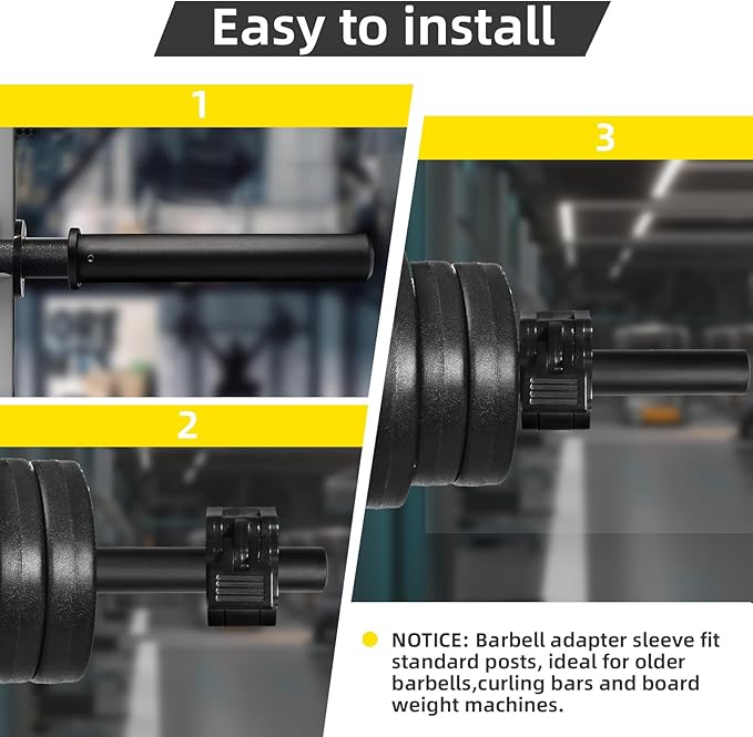 - Includes: The product includes two 12 inch adapter sleeves that convert a 1 "standard barbell into a 2" barbell bar. Including 1 secure hex socket screw and 2 fixed barbell clips.