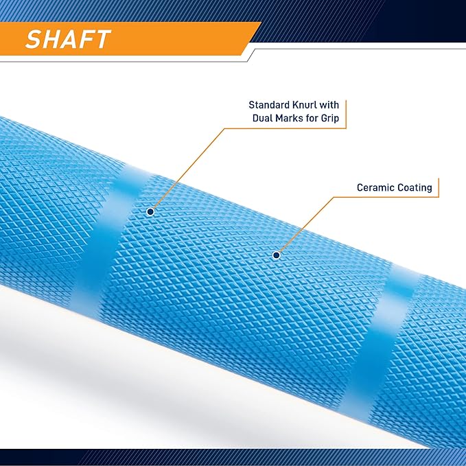 - Lighter knurling marks on the shaft of the Olympic bar are coated with ceramic, which increases friction between your hands and the bar, therefore improving overall grip