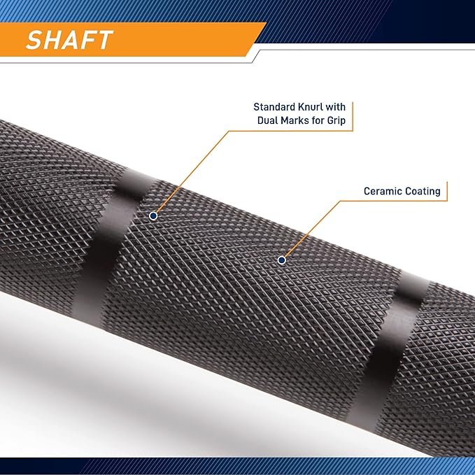 - Lighter knurling marks on the shaft of the Olympic bar are coated with ceramic, which increases friction between your hands and the bar, therefore improving overall grip