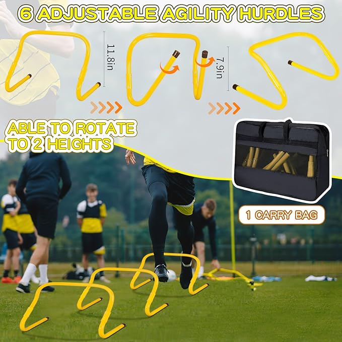 - Agility Training Equipment Set: the set of soccer agility training equipment includes 1 agility ladder for kids with 4 stakes, 6 adjustable hurdles, 16 soccer cones for training with a storage pole, 2 resistance bands with ankle strap, 1 parachute with storage bag, 5 exercise bands, 1 jump rope and 3 carries bags