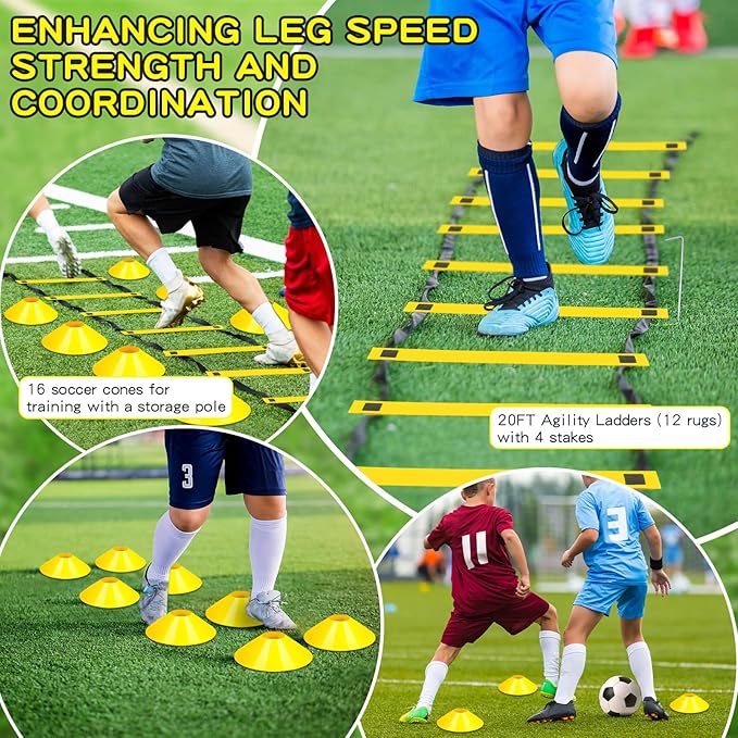 - Unlock Your Potential: the exercise ladders for agility training and other soccer agility training equipment are very suitable for professional physical training such as football, soccer, basketball, lacrosse, volleyball, baseball, softball, tennis, track and field, ice hockey, rugby, etc.; Help improve speed, agility, balance, flexibility fitness, coordination, strength and explosiveness