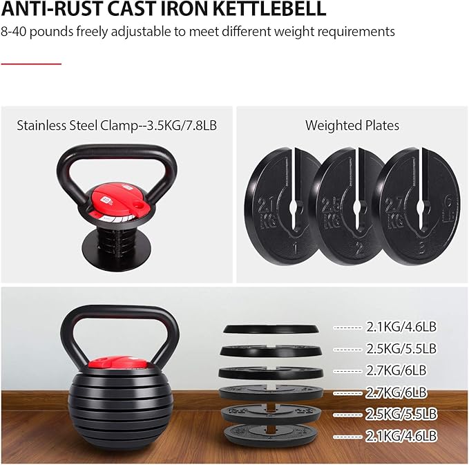 • Cast Iron Vinyl-Coated: This adjustable kettlebell is wrapped in a durable scratch-free vinyl coating to prevent corrosion, scrap hands and wreck floor; Each kettlebell lifting equipment, clearly marked with weight, ensure you do not grab the wrong bell
