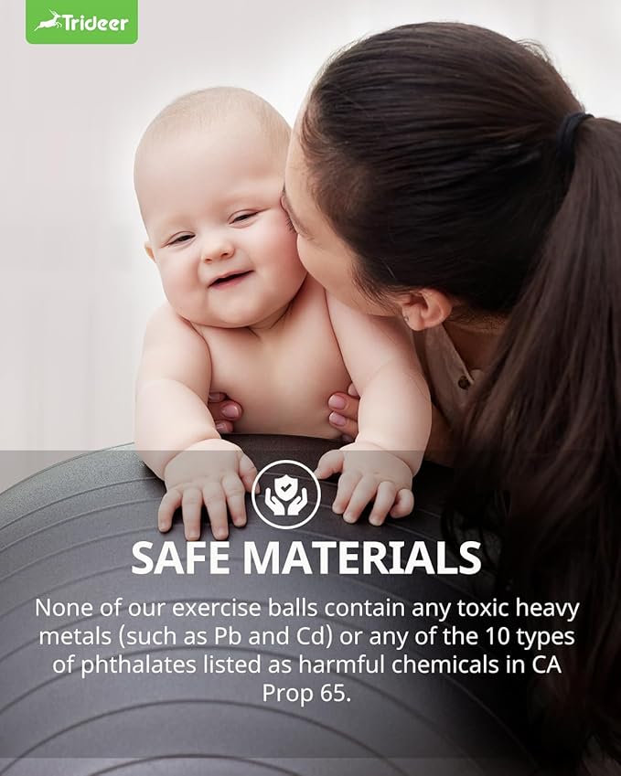 • TOP QUALITY MATERIAL - Our exercise ball proudly stands itself out among the products of the same class. It is strictly weight tested and can resist up to 330 lbs. The strong material is nicely made with non toxic PVC material, thus free of BPA & heavy metals.
