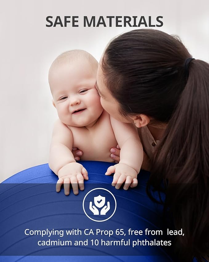 - SAFETY AND COMFORT- The exercise ball is crafted from PVC material; meticulously manufactured to be free from harmful heavy metals such as Pb, Cd, Hg, and 10 other heavy metals; safe for pregnant women and children