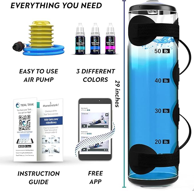 • ONLY WITH THE TIDAL TANK: EVERYTHING YOU NEED 🌊 We are fully focused on the Tidal Tank, and want to give you everything you may need, in one purchase. So we made the Tidal Tank transparent, allowing you to see the water level, and included a handy water level to weight indicator so you can see how many pounds of water to add. Furthermore, you will get FREE APP ACCESS with many exercises for your inspiration. Not satisfied for any reason? RETURN FOR FREE within 30 days.