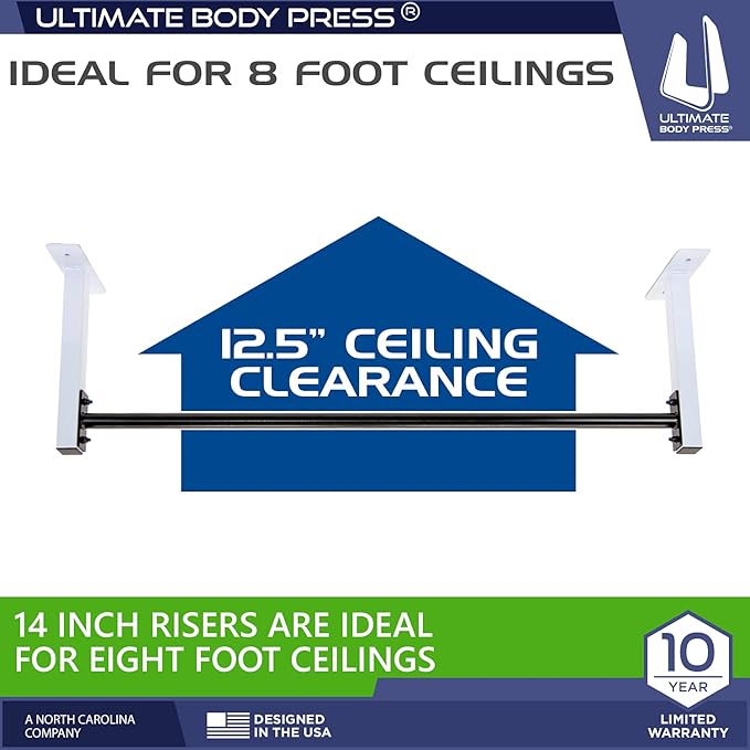 - IDEAL FOR 8' CEILINGS: Add gym-grade workouts to any room with 8 foot ceilings or any space where 14” risers suit your needs. Straight 48 inch bar offers ample room to build arms, chest, shoulders, back and core with full range of motion workouts