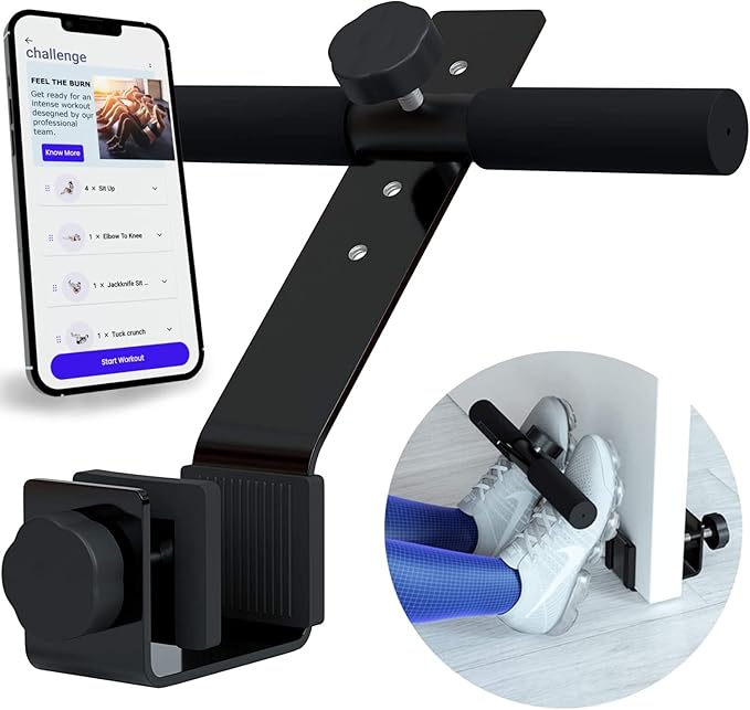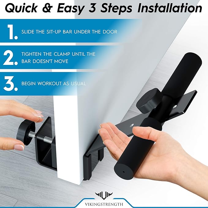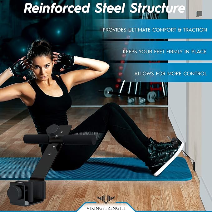 • TRAIN BETTER WITH PREMIUM SCANDINAVIAN QUALITY: Vikingstrength sit up assistant device is made of strong stainless steel, with premium foam padding providing cushioning comfort for the back of your legs. The reinforced steel structure provides you with maximum stability, and control, while the bar’s foam padding increases user’s comfort while performing ab exercises. It's also adjustable to fit securely. It works with any door and is designed to work with and fit under closed doors.