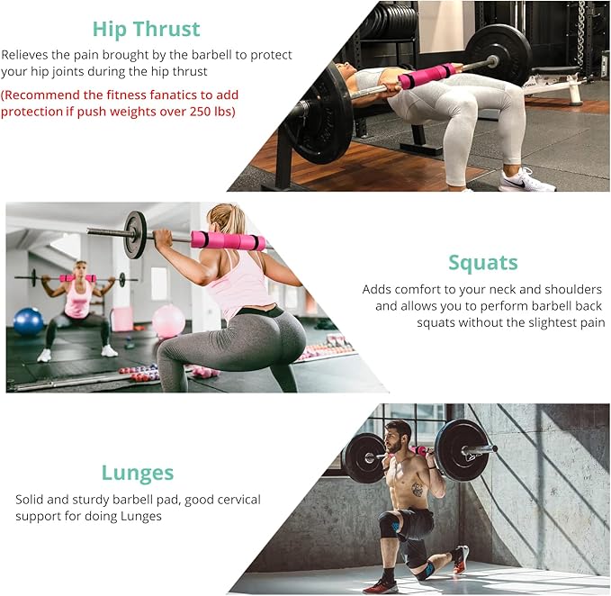 - 【UPGRADED Stable and Versatile Design】17.0*3.7 inches oxford barbell squats pad and large hoop & loop fasteners can prevent barbell from slipping and falling effectively, much better than safe shoulder straps. Cooperated with hip resistance band and gym ankle straps, supporting barbell squat, lunges, hip thrust, hip abductors and more.