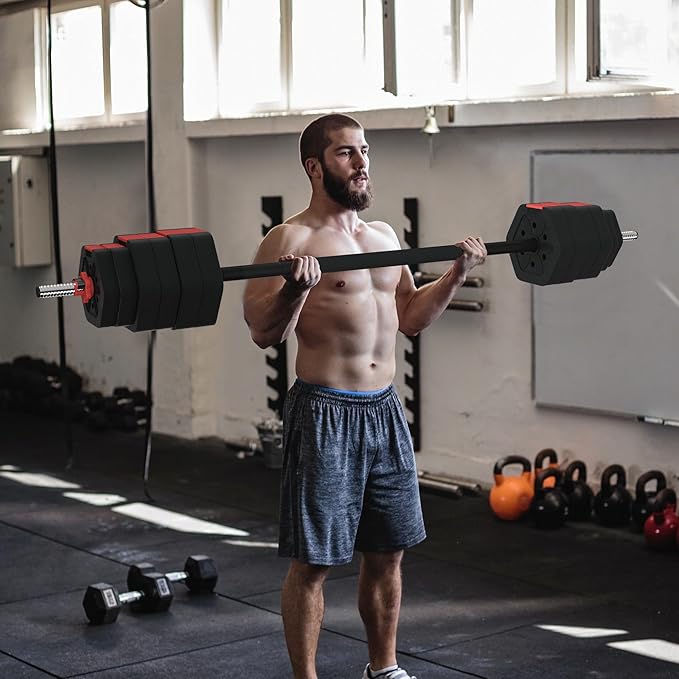 - Dumbbell & Barbell Set: Our all-in-one dumbbell-barbell set contains two dumbbell handle bars, you can switch the training modes you need randomly and perform multi-functional exercises. An all-in-one dumbbell-barbell set saves your space. No heap of different size dumbbells taking over your room
