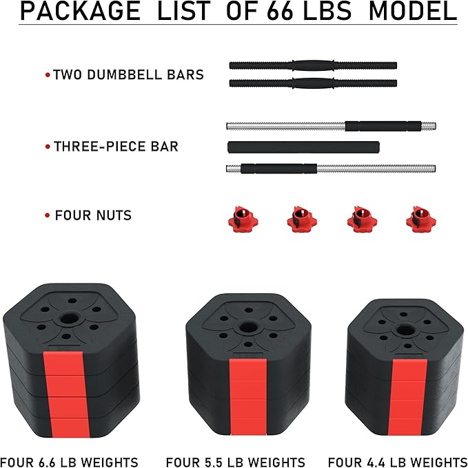 - Packing List- 66 Pound TOTAL: Four 6.6 pound weight plates, Four 5.5 pound weight plates, Four 4.4 pound weight plates, Two dumbbell bars, a three-piece bar and four nuts