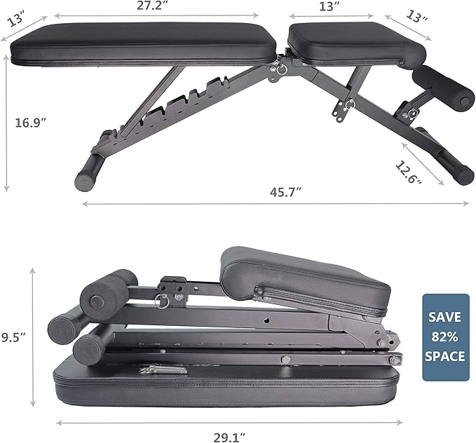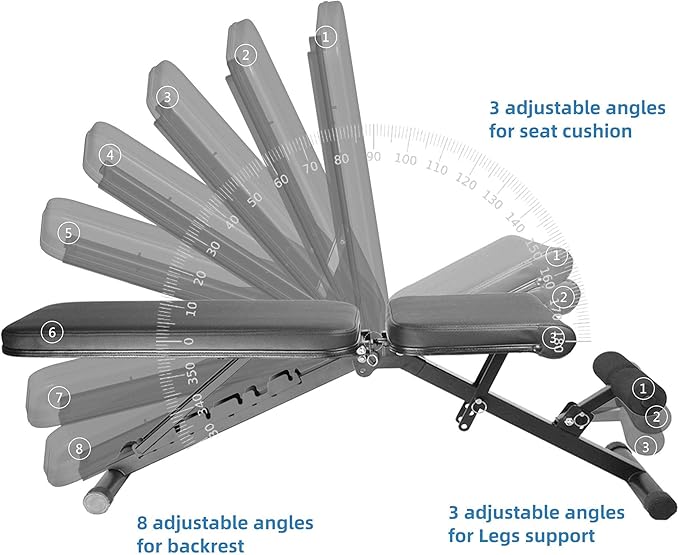 • ADJUSTABLE WEIGHT BENCH: Up to 14 adjustable positions (8 adjustable back pad positions, 3 adjustable seat positions & 3 feet supporter position)