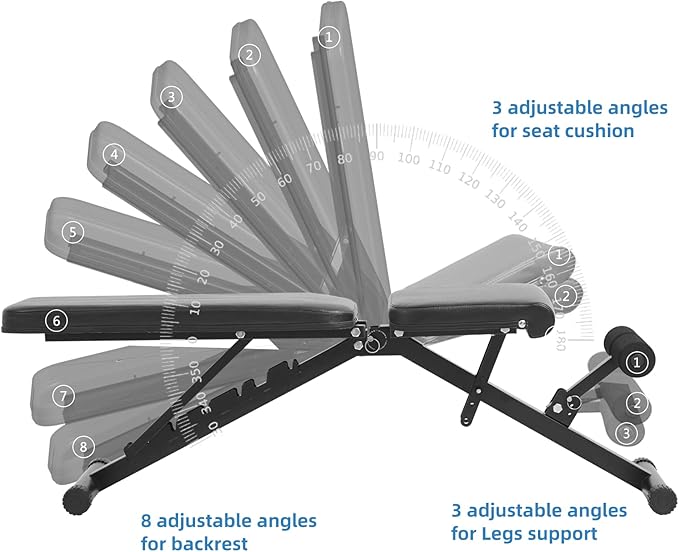 - ADJUSTABLE WEIGHT BENCH: Up to 14 adjustable positions (8 adjustable back pad positions, 3 adjustable seat positions & 3 feet supporter position)