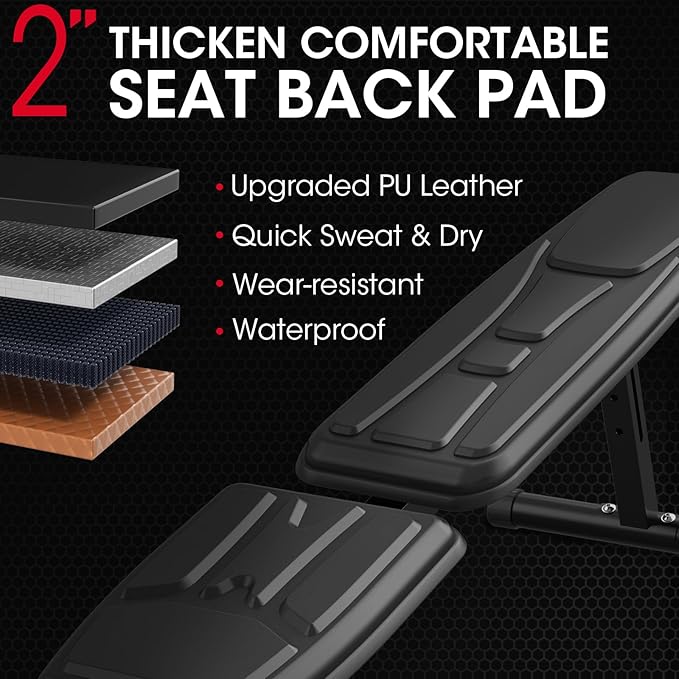 - 【Stable 860LB Weight Bench】The workout bench designed with unique stable structure and heavy-duty thickened steel. As well as carefully-designed trapezoidal structure, 19.3in wide legs, strong double groove and reinforced knob. The maximum weight capacity of the gym bench is 900 pounds, you can feel safe and secure when using it. This weight bench press is sturdy enough to withstand years of intense workouts.