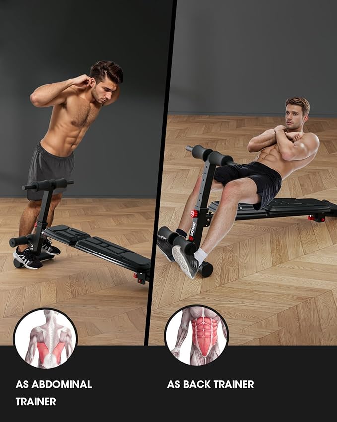 • 【4-in-1 Multi-Functional Bench】4-in-1 weight bench equal to flat bench/sit up bench/roman chair/basic bench; with 3 foot support adjustment, 5 back adjustment and 8 hand bar height adjustments, it supports diverse exercises in incline, decline and flat modes, meeting to a tailored workout experience. Get a weight bench, roman chair, and sit up bench all in one with this single strength training adjustable bench purchase.