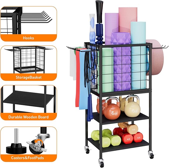 - Flexible Mobile Design: This small metal wood home gym workout equipment storage is equipped with four solid multi-directional wheels and two brake equipped wheels, making movement easy and effortless. At the same time, 4 adjustable foot pads ensure the stability of the shelf on any floor, meeting your different needs.