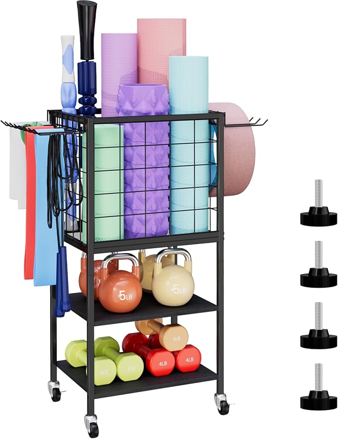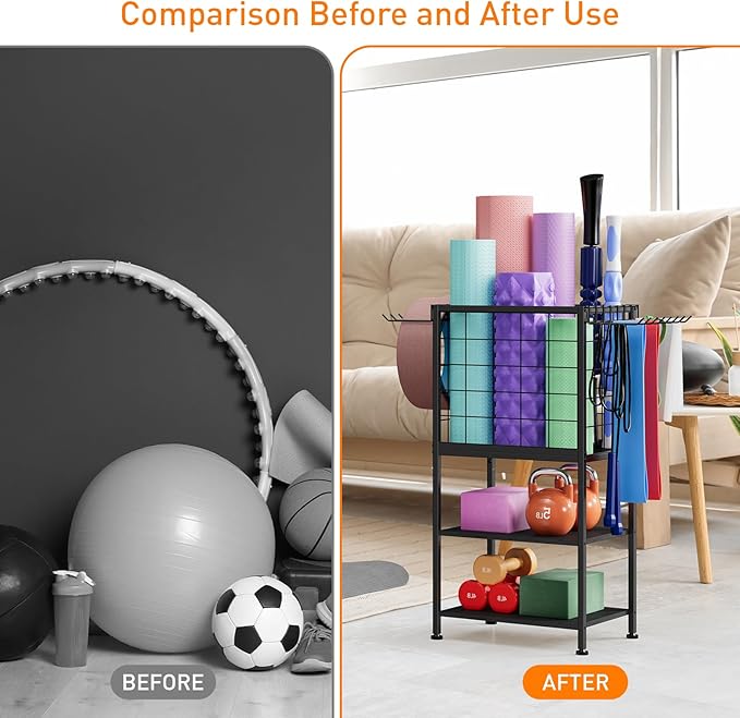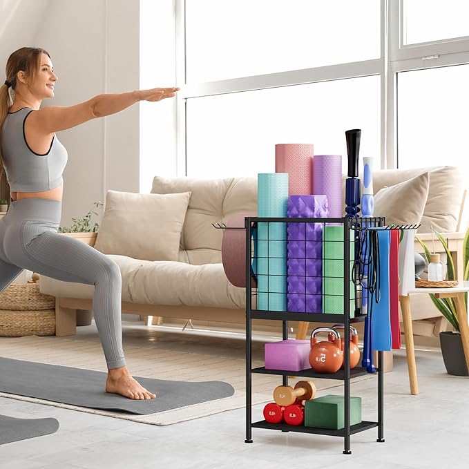 - Multifunctional Home Gym Storage Rack: This yoga mat storage rack is specially designed for the family gym. It integrates a yoga basket and a fitness rack. It can neatly store yoga mats, foam rollers, dumbbells, kettlebells, yoga belts, skipping ropes, sports water bottles, fitness hula rings, etc., making all equipment orderly and convenient to use.