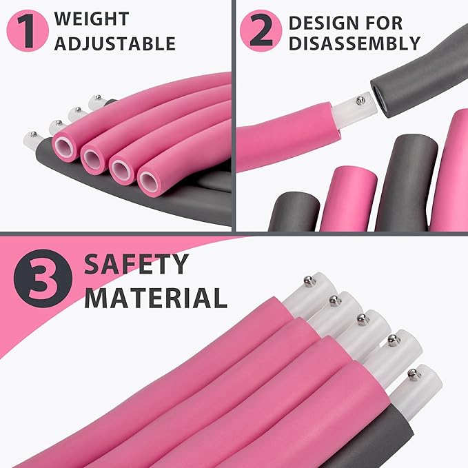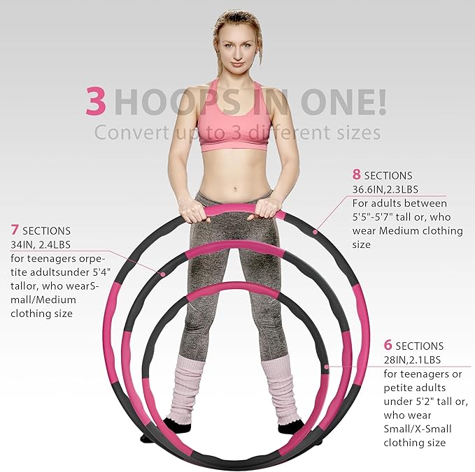 - ADJUSTABLE SIZE The 8 section women hula hoops is easy to adjust to a smaller or larger hoop. You can just take out a section to create the best training size. It is simple to assemble and disassemble for storage.
