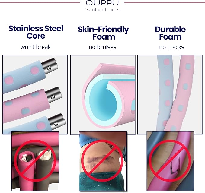 - Weighted Hula Hoop for Women - Unlike many other cheap, fragile, plastic not weight hula hoop that are very unstable, flimsy with ripped foam or break after a few uses, our premium stainless steel hula hoops for adult and beginners is crafted with high-quality stainless steel tube covered with thick 2 layers skin friendly soft foam & is designed to last, so you won’t have to replace your hula hoops for adults in 2 weeks like with other plastic fitness hoola hoop.