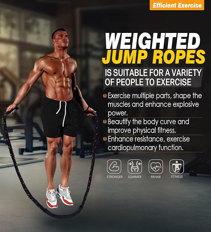 - 💪【Workout Anywhere】Whether you’re at home, at the gym or at the office, only have a small work out space, rather than cost a lot of time and money to gym.You can count on our heavy jump rope to help you train and condition your body, build the perfect curve of abdominal muscles, chest muscles, back muscles and leg muscles.