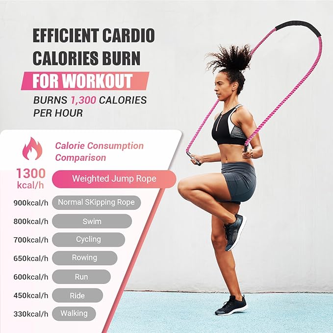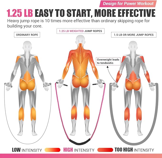 • [WEIGHTED JUMP ROPE DESIGNED FOR WOMEN] Weighted Jump Rope is a great way to get fit, 1.25 lbs Weighted Jump Rope for Beginners is an entry level Weighted Jump Rope for Women, Not too heavy to cause tendonitis. Helps work the entire body and ignites calorie burning with each energizing jump, building endurance and promoting weight loss.
