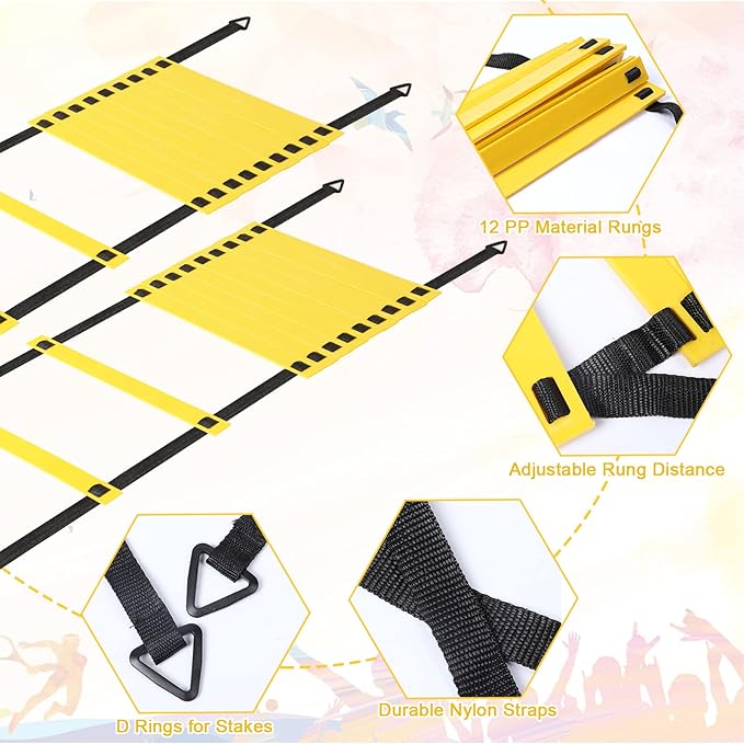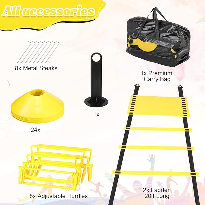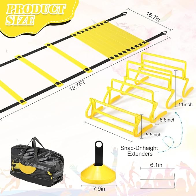 • Sufficient Quantity: you will receive 2 pcs 20 ft 12 rung agility ladder with 8 pcs ground stakes, 8 pcs agility hurdles with 24 disc cones and 1 pcs carry bag, whether you're a beginner or an expert, these equipment can meet your training needs