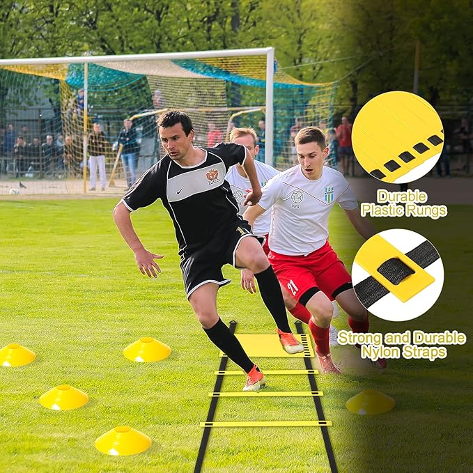 • Ideal Training Equipment: with this agility ladder set, you'll be able to constantly increase your balance, leg strength, overall body control, agility and explosiveness; Agility cones allow you to set up shuttle cones and many other drills to improve your acceleration and power when changing directions