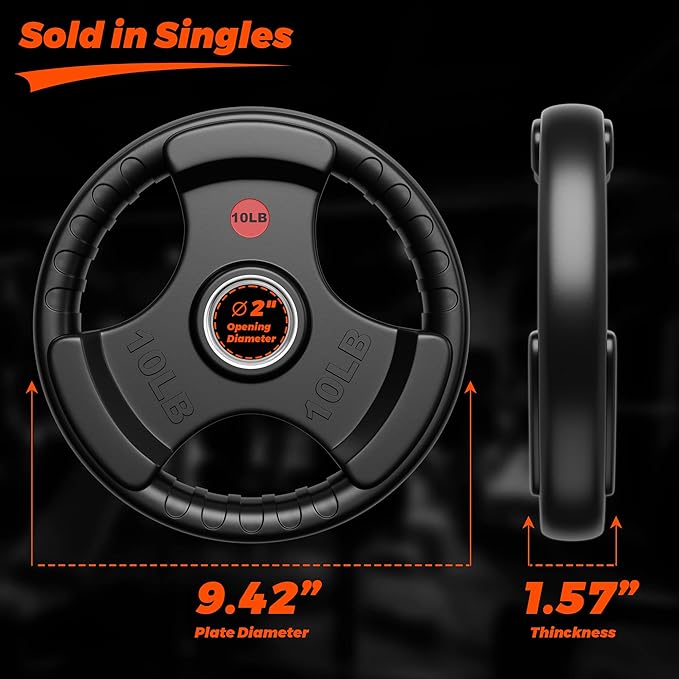 - EASY GRIP – The Olympic weight plates is designed with three holes and there are grooves in the grip holes for easy and safe handling when loading and unloading heavy objects. Descending and lowering after weight training is safer and more practical. The comfortable grip also gives you a good using experience.