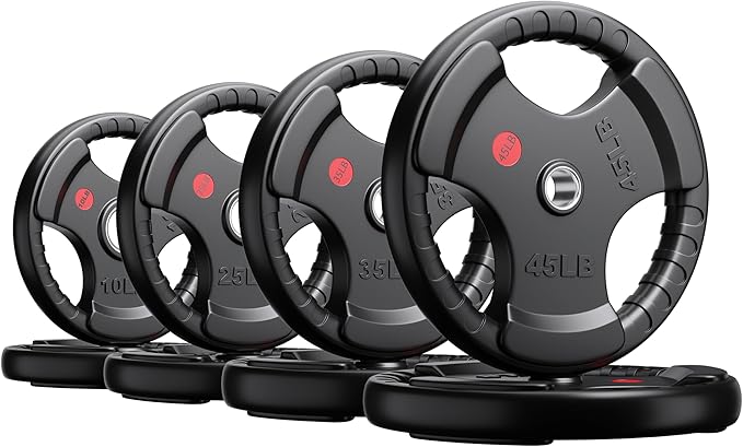 - EASY GRIP – The Olympic weight plates is designed with three holes and there are grooves in the grip holes for easy and safe handling when loading and unloading heavy objects. Descending and lowering after weight training is safer and more practical. The comfortable grip also gives you a good using experience.