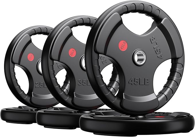 - EASY GRIP – The Olympic weight plates is designed with three holes and there are grooves in the grip holes for easy and safe handling when loading and unloading heavy objects. Descending and lowering after weight training is safer and more practical. The comfortable grip also gives you a good using experience.