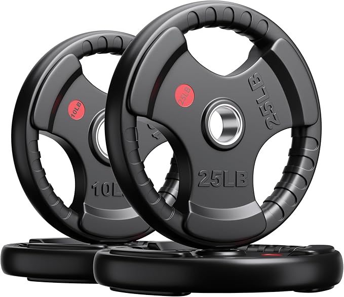 - EASY GRIP – The Olympic weight plates is designed with three holes and there are grooves in the grip holes for easy and safe handling when loading and unloading heavy objects. Descending and lowering after weight training is safer and more practical. The comfortable grip also gives you a good using experience.