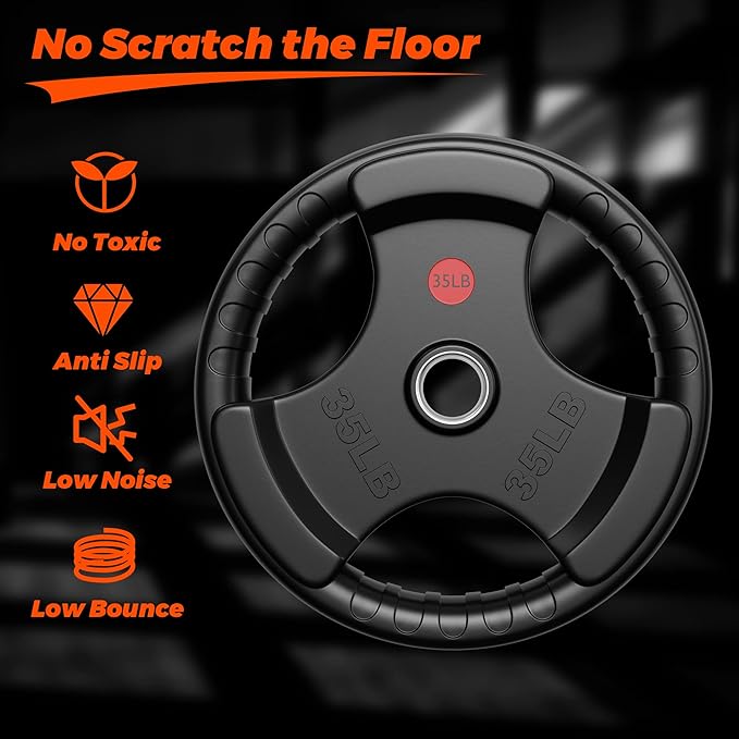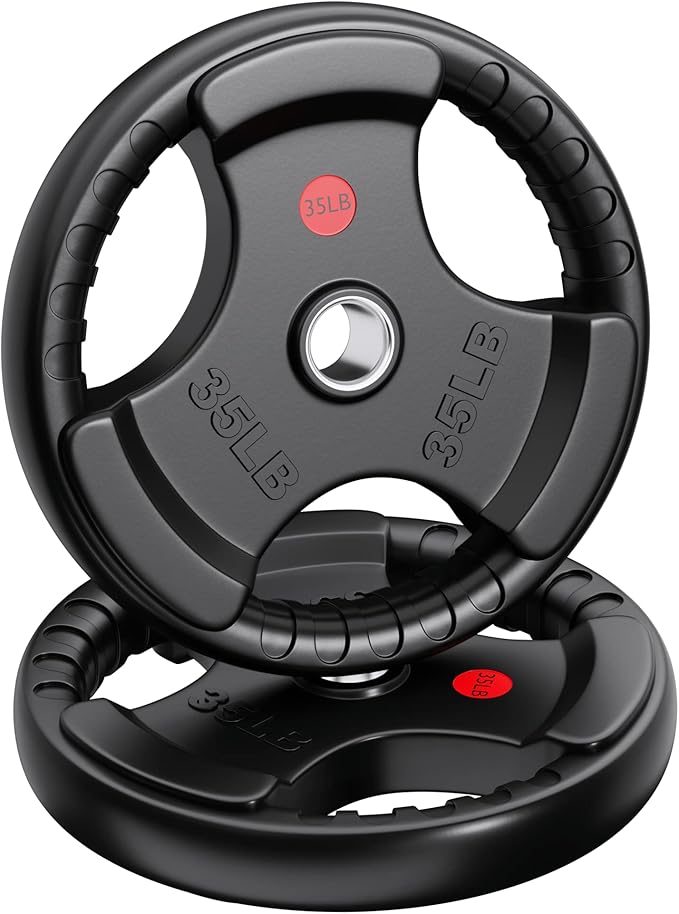 - EASY GRIP – The Olympic weight plates is designed with three holes and there are grooves in the grip holes for easy and safe handling when loading and unloading heavy objects. Descending and lowering after weight training is safer and more practical. The comfortable grip also gives you a good using experience.